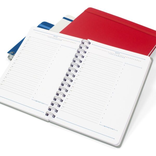 Finisare: spira metalica argintie • colţuri rotunjite bloc si coperta • elastic asortat in ton sau in contra ton cu coperta