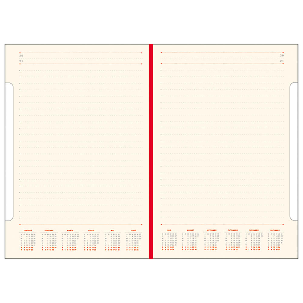 Finisare: cusuta, legata • stanţata • sistem de prindere din elastic, asortat cromatic cu coperta, pentru instrument de scris.