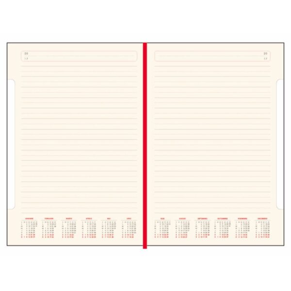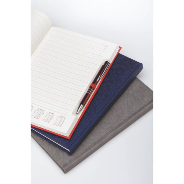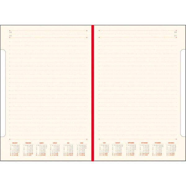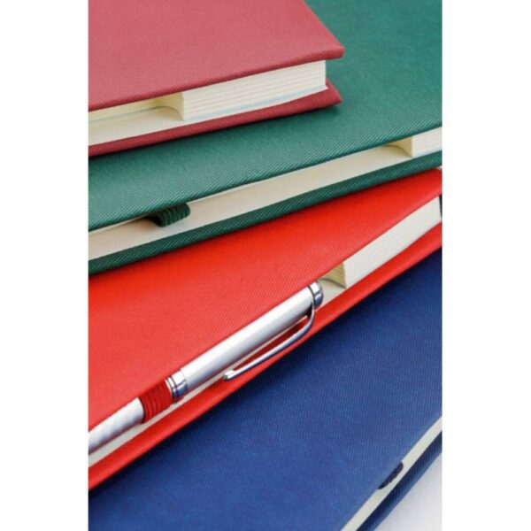 Finisare: cusuta, legata • stanţata • sistem de prindere din elastic, asortat cromatic cu coperta, pentru instrument de scris.
