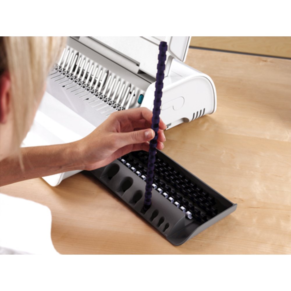 Aparat de indosariat electric cu inele din plastic. Tava de depozitare pentru consumabile, cu sistem patentat de masurare a inelelor si a documentelor. Kit de baza inclus pentru 10 documente. Capacitate de perforare: 20 coli. Capacitate de indosariere: 300 coli. Diametru maxim spirala: 38 mm. Greutate: 9,5 kg. Dimensiuni: 130 x 432 x 388 mm.