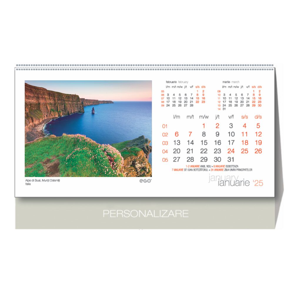 Adauga un plus de organizare si eleganta pe biroul tau cu calendarele noastre de birou. Cu un format compact si elegant, acest calendar ofera nu doar functionalitate, ci si o oportunitate de personalizare pentru a reflecta brand-ul sau mesajul tau. Imprimarea fata-verso pe hartie dublu cretat mata de 130 g/m² asigura un aspect deosebit si o utilizare indelungata.