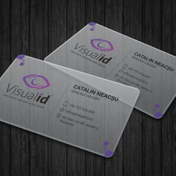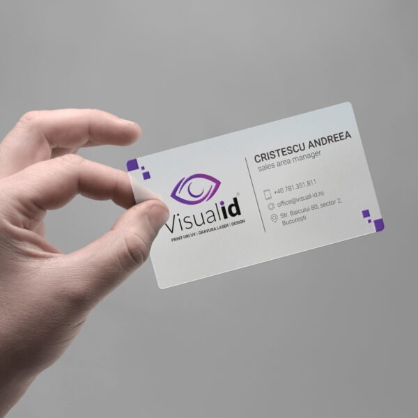 Cartile de vizita transparente sunt imprimate UV, in policromie, pe polipropilena de 0.5 mm grosime si dupa caz, pot beneficia de lacuire selectiva sau colturi rotunjite.