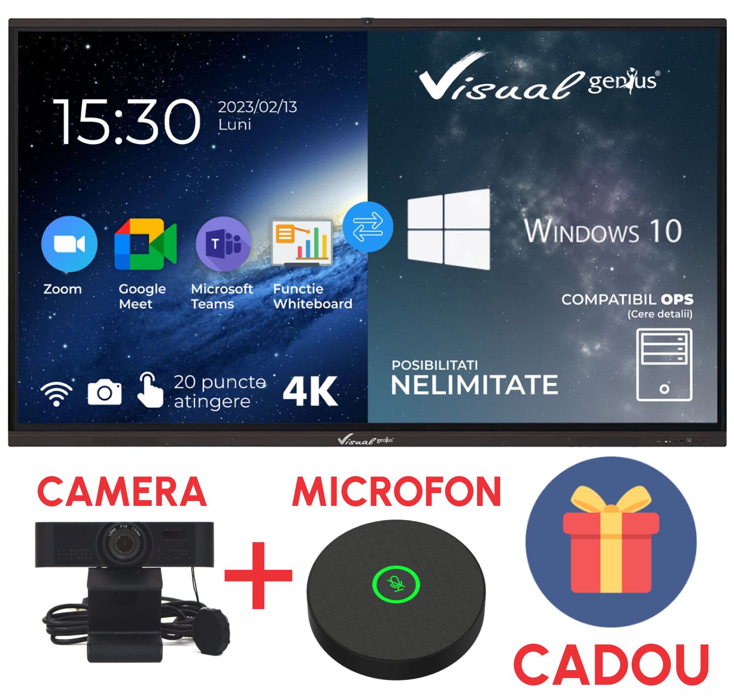 Display interactiv 65” 4K, Visual Genius A9, Android 13, 4GB DDR4, 32GB memorie, 40 puncte de atingere, soft limba romana.