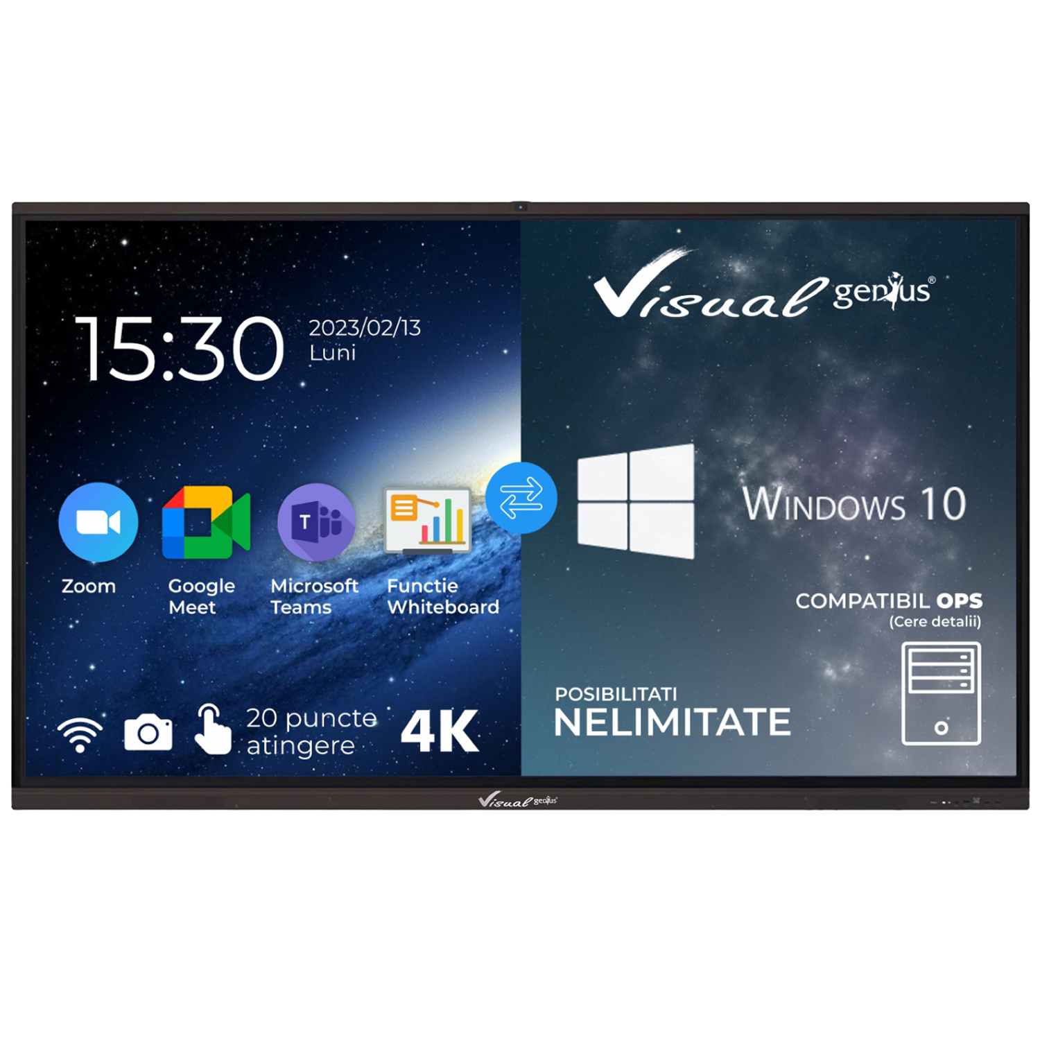 Display interactiv 86” 4K, Visual Genius, Android 9, 3GB DDR4, 32GB memorie, 20 puncte de atingere, soft limba romana.